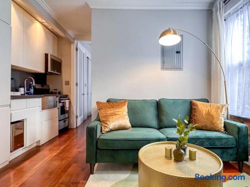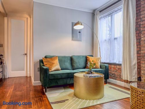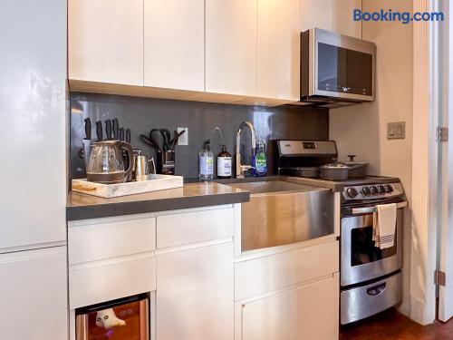 This property is a private dwelling. We operate as a landlord, offering a fully furnished residence for self-sufficient living without hotel-style amenities or services. You will have sole access to the place and complete privacy throughout your stay. ACCESS ➲ Self Check-In: You will receive a secure link with lockbox instructions or entry codes after booking. Local security regulations may require guests to provide contact details prior to arrival. ➲ Monitoring: Noise detectors monitor volume levels (not speech) inside the residence to keep neighbors happy. Exterior cameras are present in common/shared areas only. ➲ Privacy Policy: Our team only accesses the property for emergencies or exterior upkeep. SELF-SERVICE ➲ Housekeeping: We do not provide daily cleaning, turndown, or fresh towels during your stay. The space is professionally cleaned and stocked with linens only before you arrive. ➲ Essentials: We provide a "Starter Kit" (soap, toilet paper, dish soap) for your first few days. Guests are responsible for replenishing supplies for longer stays. ➲ No Smoking: Strictly prohibited anywhere on the premises. ➲ No Front Desk: We do not offer concierge services, luggage storage, or extra linens on demand. ➲ No Meals: We do not offer room service or food delivery. The residence includes a full kitchen equipped with stove, fridge, and cookware for home-cooked meals. BUILDING FACILITIES ➲ Parking: No dedicated parking provided. The nearby public garage charges ~$45/night. Free street parking is scarce. ➲ Pool/Gym: No pool or gym available. RESIDENCE ➲ Sleeping: 2 Queen Beds (sleep 4, bedding included). ➲ Tech: Smart TV (Living Area), Standard-Speed WiFi (100-300 Mbps), No AC for cool air. Radiator Heating is on during winter (can't be controlled). ➲ Laundry: Washer/Dryer in-unit (detergent not provided). ➲ Noise: Expect some neighbor noise. Expect city noise during the day and early morning. ➲ Note: Hot water can be intermittent.