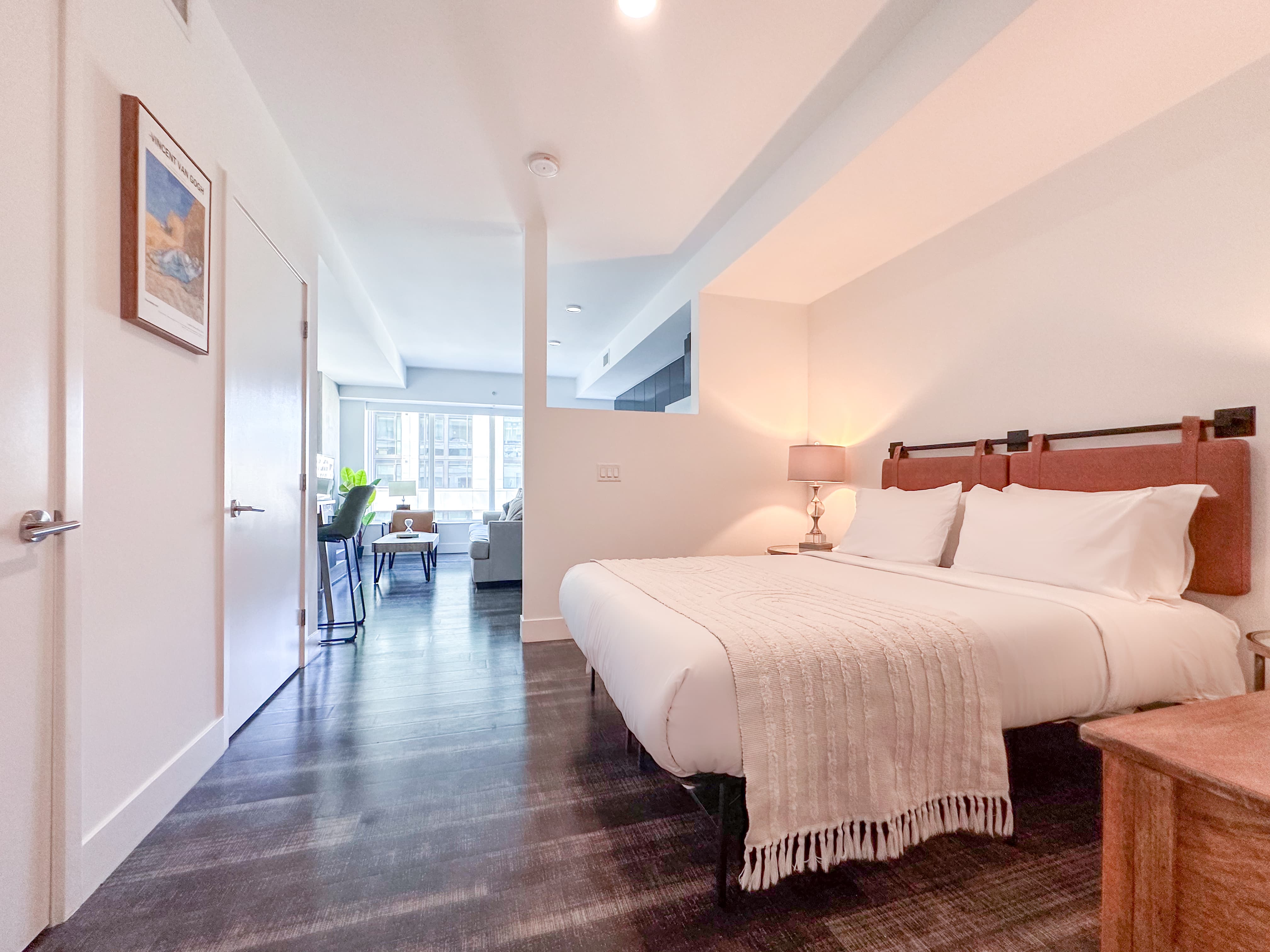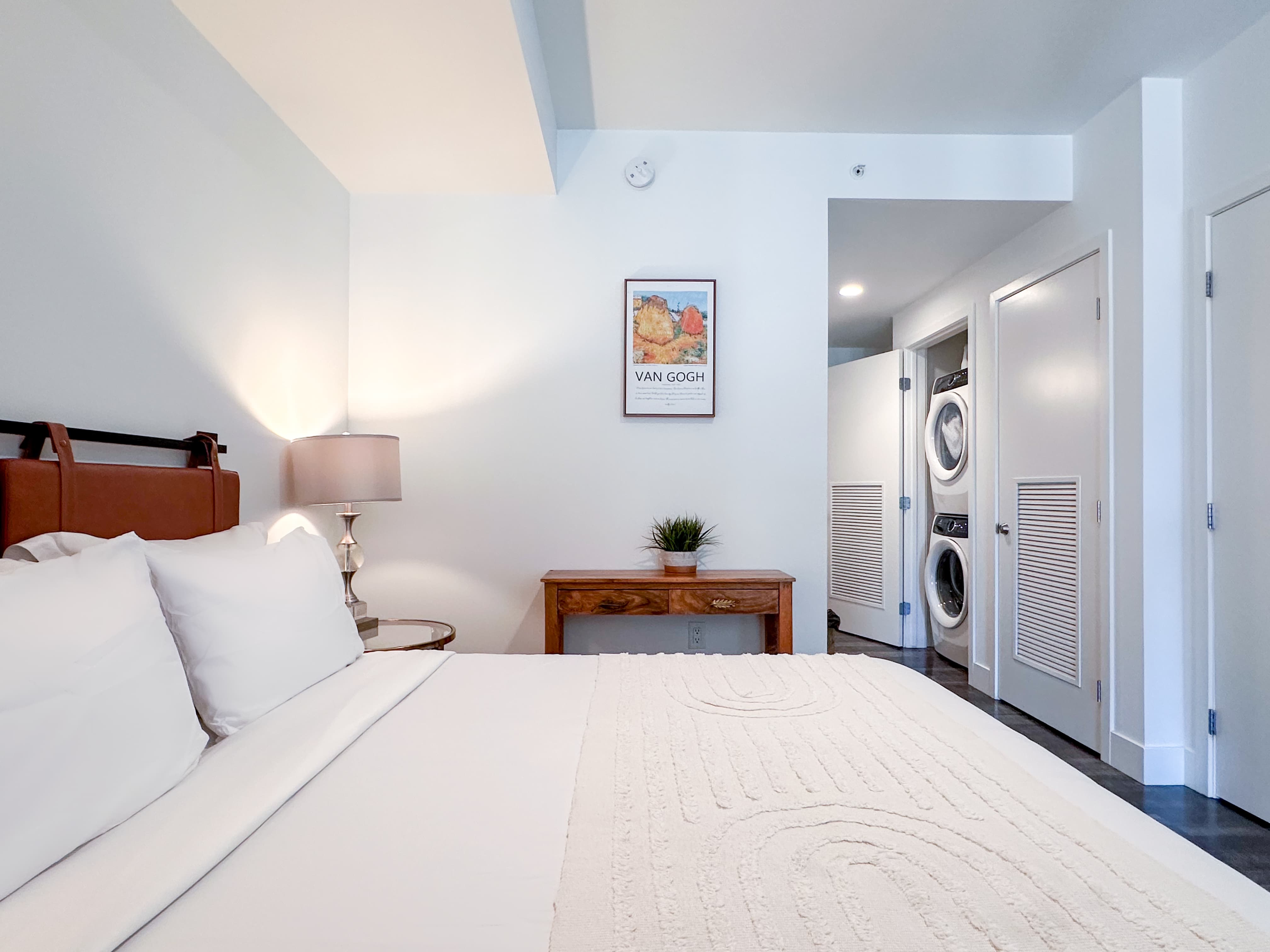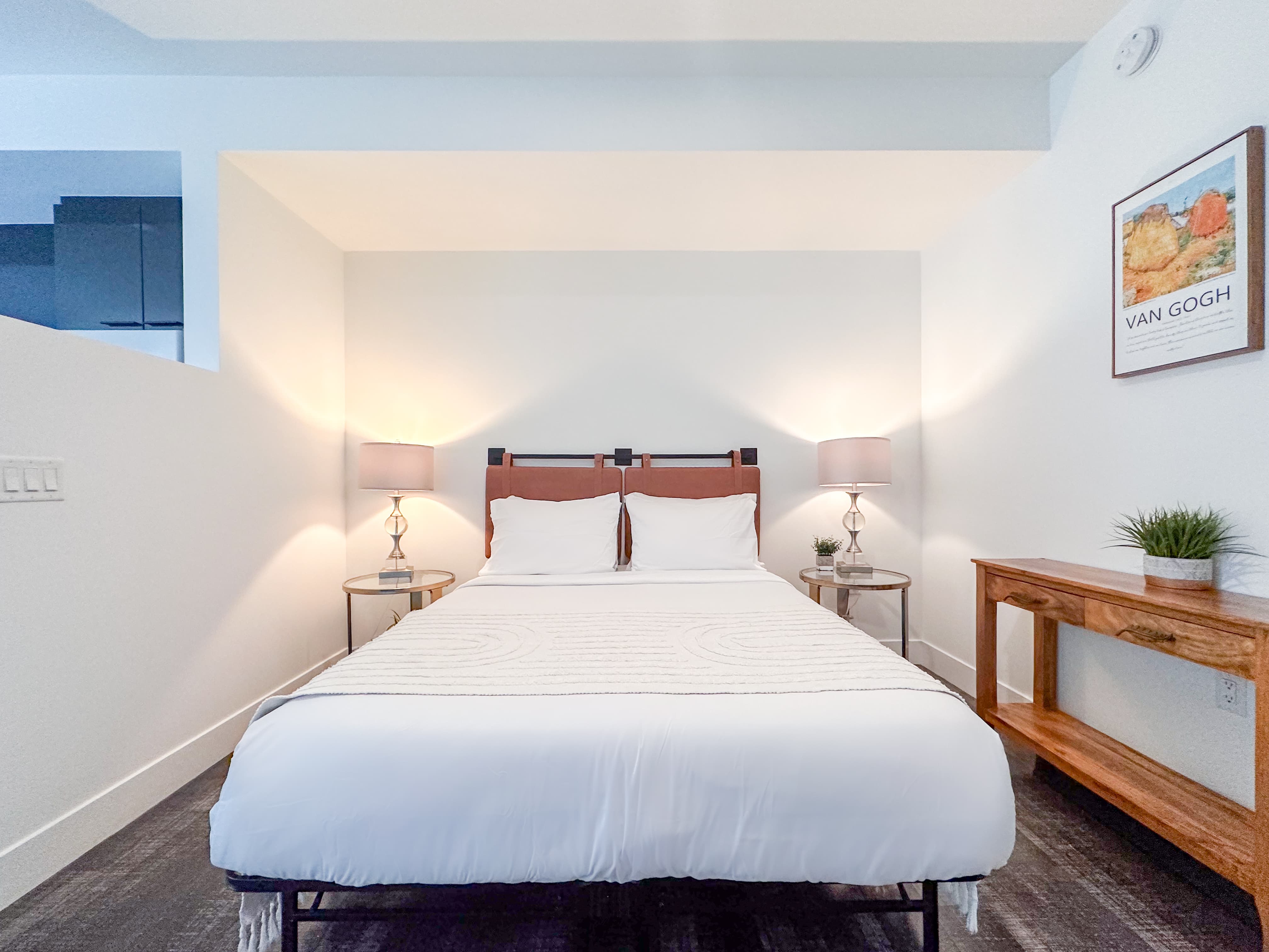 Privacy • Fully private listing with it's own entrance. • Noise decibel monitor (no recording). Parking • Street parking nearby (hard to find). • Paid parking lot/garage (~$10/night). • No on-site parking available. • Tesla supercharger 10 min drive. Amenities • 600 sq ft (55 sq m). • Central AC for cool/hot air. • 1 queen bed, bedding, towels. • 200 Mbps WiFi, smart Roku TV. • Washer/dryer inside rental. • Pool access on request. • Gym access on request. Not provided • No steamer or iron. • No bathrobe or slippers. Kitchen • Full kitchen, cookware, dinnerware, glasses. • Coffee maker (ground coffee), water filter. Noise/view • Usually quiet at night. • Possible noise from street/neighbors. • View of downtown skyline, no balcony. Self check-In • Receive a link for online check-in and address. Early arrival • Receive early check-in notification on arrival day. • Early check-in can't be guaranteed in advance. • Luggage drop-off usually possible after 1:30 pm. No Smoking • No cigarettes/marijuana inside or on property. • $300 fee for violations to cover odor removal. • Smoking only allowed outside on the street.