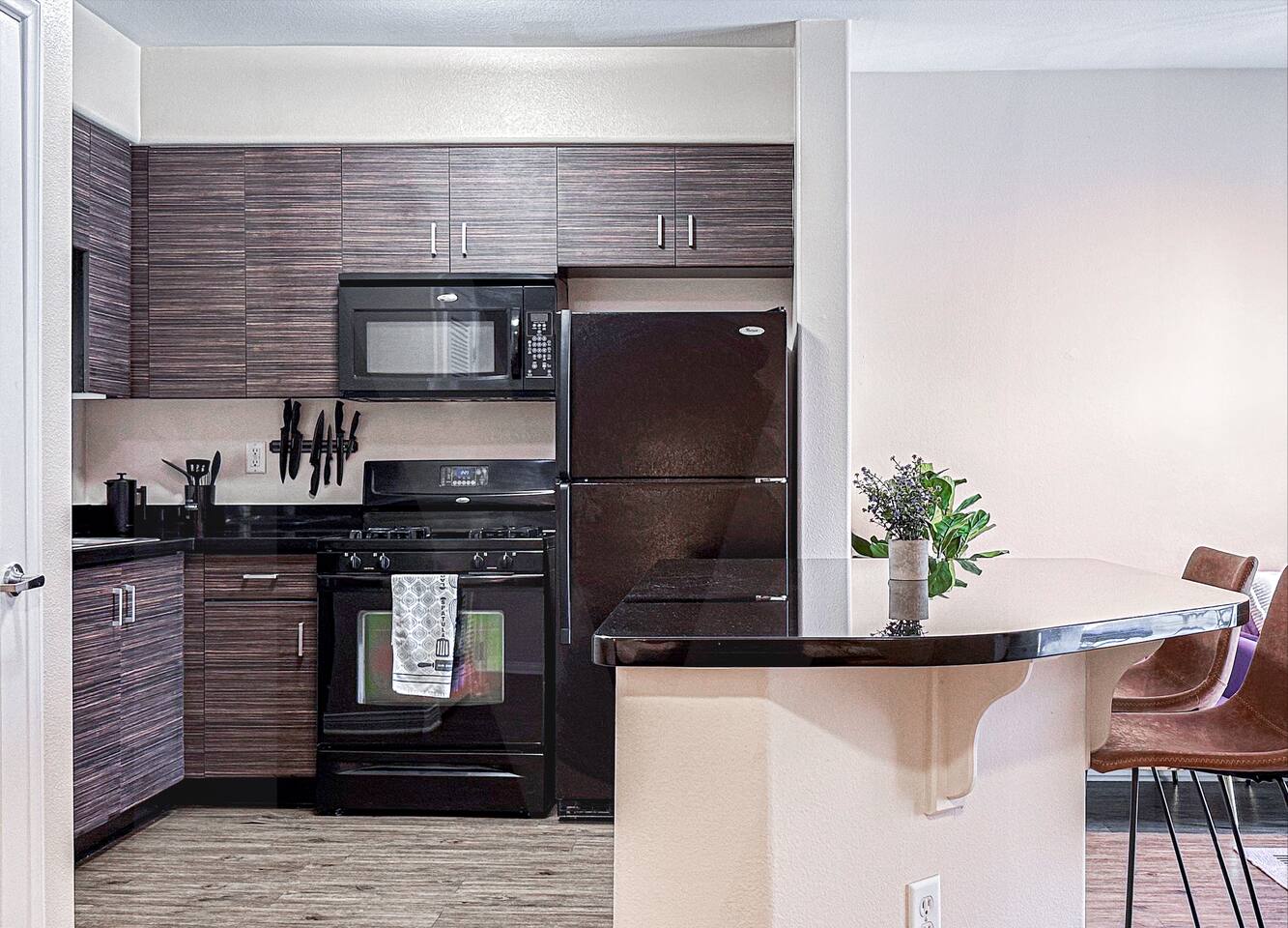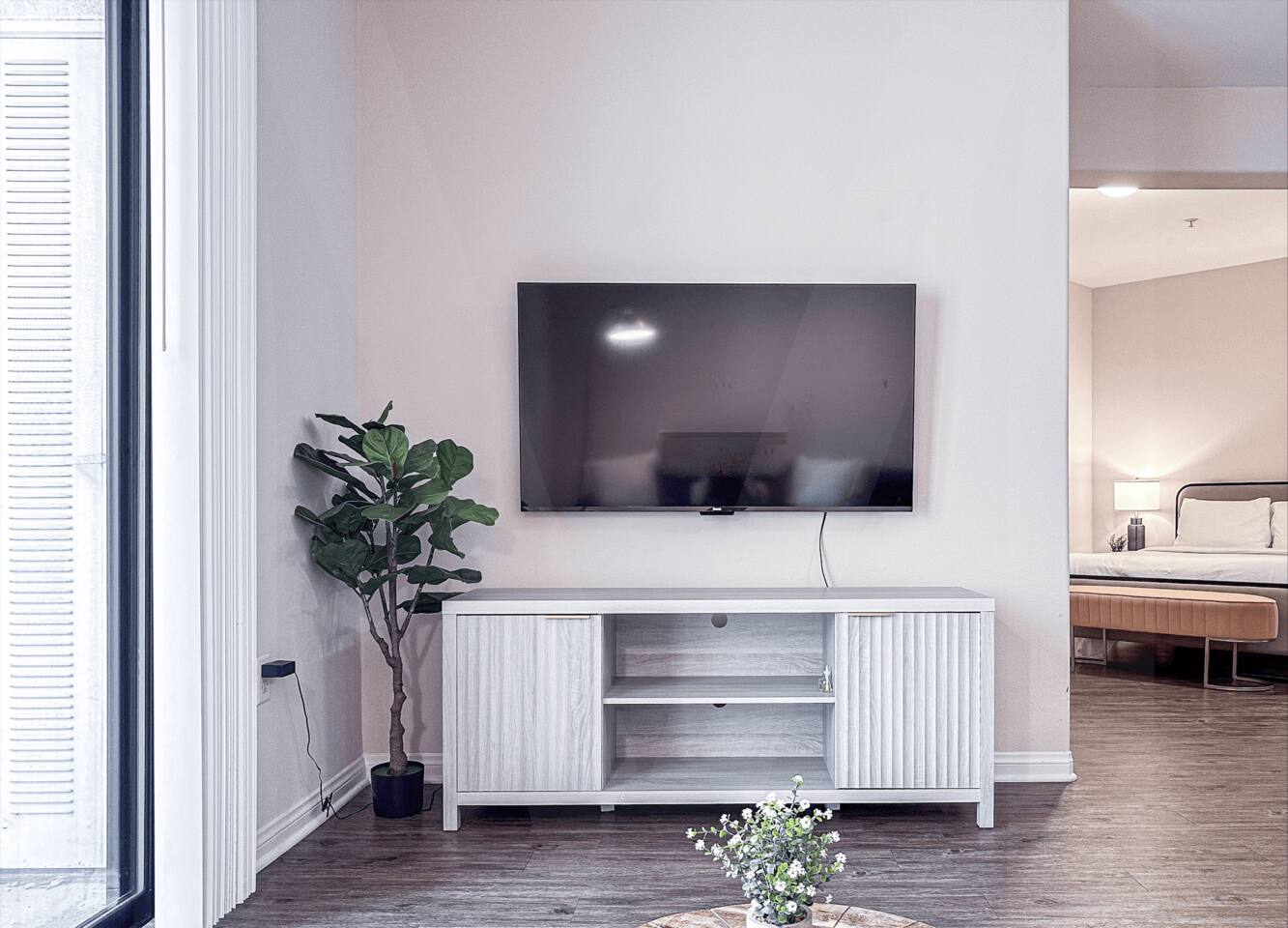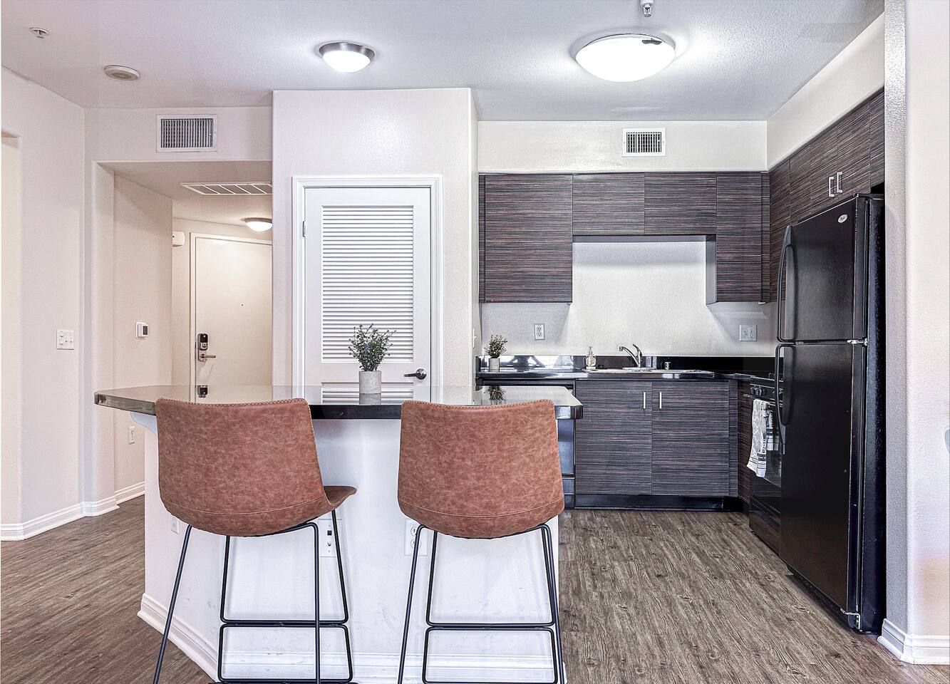 This property is a private dwelling. We operate as a landlord, offering a fully furnished residence for self-sufficient living without hotel-style amenities or services. You will have sole access to the place and complete privacy throughout your stay. ACCESS ➲ Self Check-In: You will receive a secure link with lockbox instructions or entry codes after booking. Local security regulations may require guests to provide contact details prior to arrival. ➲ Monitoring: Noise detectors monitor volume levels (not speech) inside the residence to keep neighbors happy. Exterior cameras are present in common/shared areas only. ➲ Privacy Policy: Our team only accesses the property for emergencies or exterior upkeep. SELF-SERVICE ➲ Housekeeping: We do not provide daily cleaning, turndown, or fresh towels during your stay. The space is professionally cleaned and stocked with linens only before you arrive. ➲ Essentials: We provide a "Starter Kit" (soap, toilet paper, dish soap) for your first few days. Guests are responsible for replenishing supplies for longer stays. ➲ No Smoking: Strictly prohibited anywhere on the premises. ➲ No Front Desk: We do not offer concierge services, luggage storage, or extra linens on demand. ➲ No Meals: We do not offer room service or food delivery. The residence includes a full kitchen equipped with stove, fridge, and cookware for home-cooked meals. BUILDING FACILITIES ➲ Parking: No dedicated parking provided. The nearby public garage charges ~$25/night. Free street parking is scarce. ➲ Pool/Gym: Access to the building's common pool is available to tenants/guests (subject to building management closures). No gym access. RESIDENCE ➲ Sleeping: 1 Queen Bed (sleeps 2, bedding included), 1 Sofa (sleeps 1, Note: bedding/linens not provided for sofa). ➲ Tech: Smart TV (Living Area), Standard-Speed WiFi (100-300 Mbps), Thermostat (AC/Heat). ➲ Laundry: Washer/Dryer in-unit (detergent not provided). ➲ Condition: Finishes are slightly dated but fully functional. Furnishings show normal residential wear. ➲ Noise: Well-insulated walls minimize neighbor noise. Expect minimal city noise during the day. Privacy • Fully private with its own entrance. • Noise decibel monitor (no recording). Parking • Street parking near the rental. • Paid parking lot/garage ~$25/night. • No on-site parking is available. • Tesla supercharger is 10 min drive. Amenities • 500 square feet (50 sq.m.). • Central AC for cool and hot air. • 1 queen bed, bedding, towels. • 100 Mbps WiFi, smart Roku TV. • Washer/dryer inside the rental. Not provided • No iron or steamer. • No bathrobe or slippers. • No pool or gym. Kitchen Full kitchen, cookware, coffee maker, water filter, dinnerware and glasses. Noise/view Usually quiet at night, facing the courtyard. There might be some noise from the neighbors. Self check-In • Receive a link for online check-in and address. Early arrival • Receive early check-in notification on arrival day. • Early check-in can't be guaranteed in advance. • Luggage drop-off usually possible after 1:30 pm. No Smoking • No cigarettes/marijuana inside or on property. • $300 fee for violations to cover odor removal. • Smoking only allowed outside on the street.
